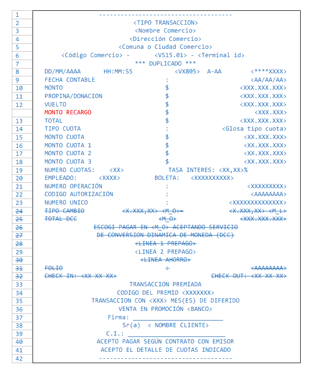 El pinpad entregará el voucher listo para imprimir, pero también entregará todos los datos necesarios para que la misma caja construya el voucher por sí misma. Si se requiere obtener el voucher duplicado la caja debe construir el voucher, sin los datos de PEL y agregando la glosa duplicado.