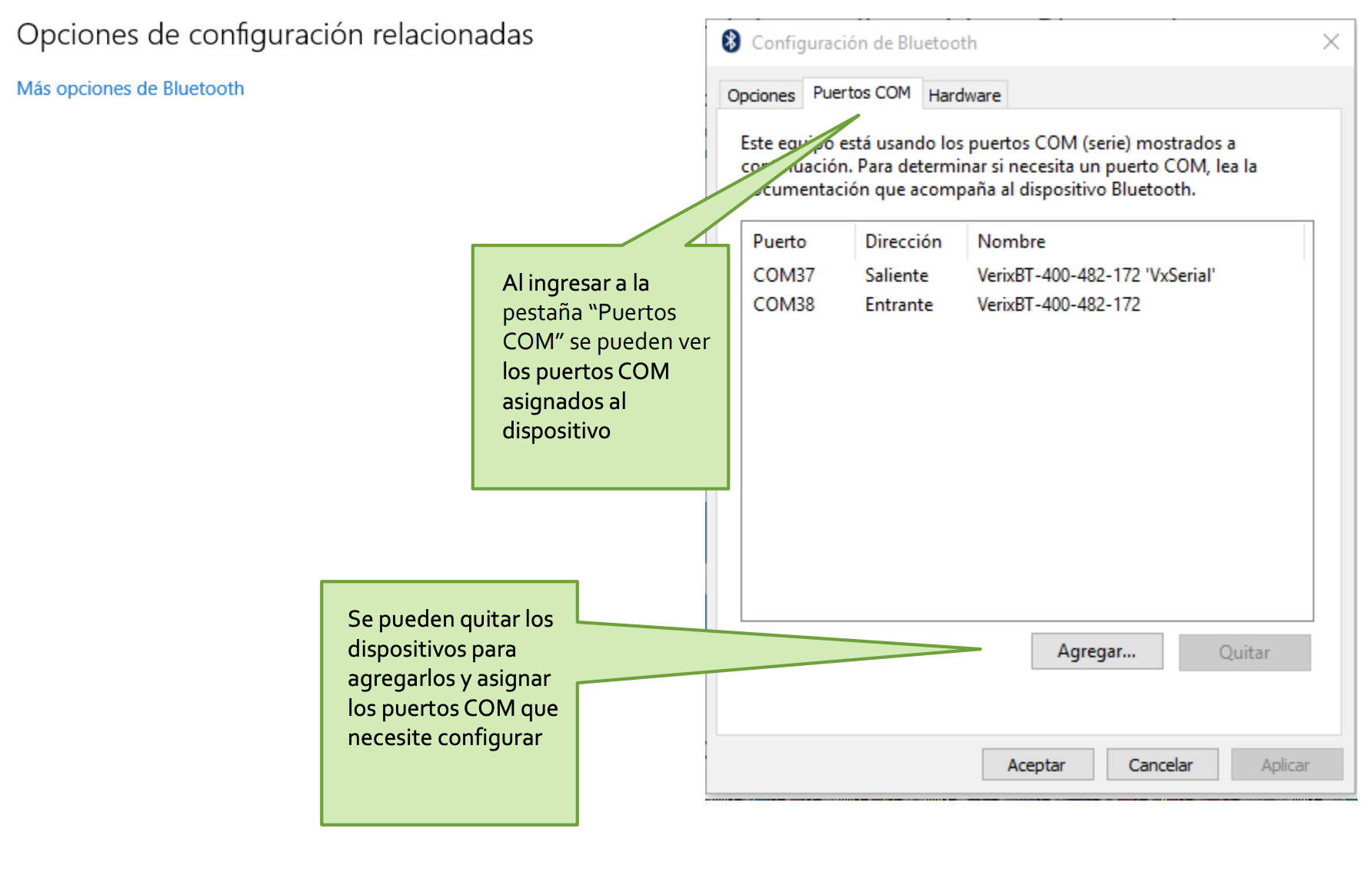 Cuando se realiza el enlace se crean 2 puertos COM que se enlazan al Bluetooth. Para poder revisarlo se debe ingresar a: Dispositivos
