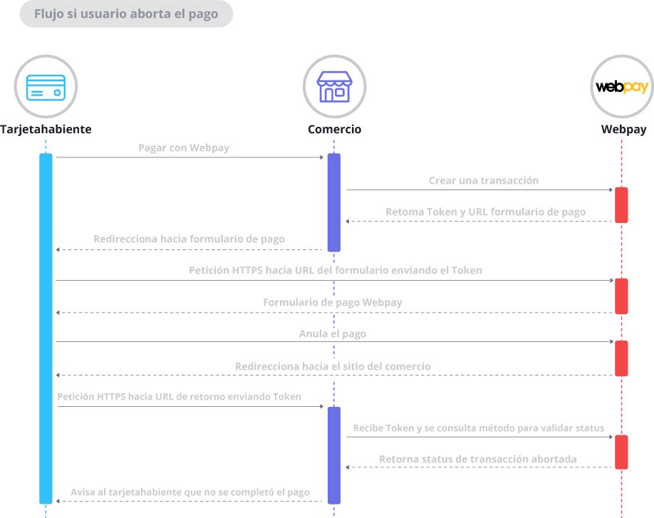 Si el tarjetahabiente anula la transacción en el formulario de pago de Webpay, el flujo cambia y los pasos son los siguientes: